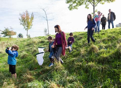These trees are a mix of native species which have been planted to create a diverse habitat and improve air quality, and paths cut through the wilder patches mean people and pollinators can walk side by side.