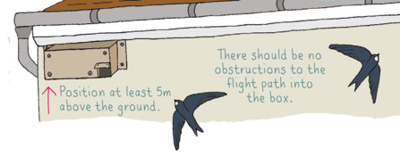 Swifts like to leave their nests by dropping into the air from the entrance. This is why they often choose to set up camp in the eaves of buildings. If you have a wall that's at least five metres tall, with a clear flyway in front, then installing a swift box or brick onto your own home is a great idea!