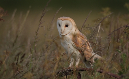 A very pale, slender owl, typically white on the underparts and golden-brown with grey markings on the upperparts. It has a white, heart-shaped facial disk with dark eyes. This, and its pale plumage, separate it from any other resident owl. Usually seen over grassland or farmland.