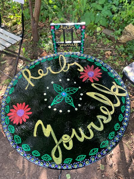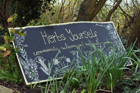 Sticking to their environmentally-friendly morals, the group try to use re-use and re-purpose materials, and they have made their main sign out of an old kitchen table, and have used painted rocks to create labels for the herbs they are growing.