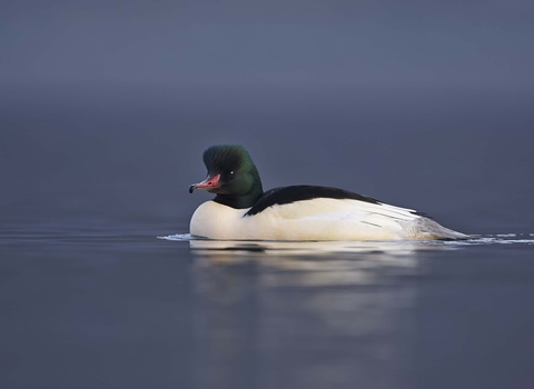 The streamlined goosander is a handsome bird and a great fisher - its long, serrated bill helps it to catch and hold its slippery fish prey. It nests in riverbank trees, but can be seen on lakes and reservoirs in winter.