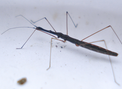 The Common water-measurer is a long-legged, thin, brown bug that lives on the surface of the water and around the edges of ponds and marshes. A scavenger and a hunter, it feeds on small insects that float to the surface, whether dead or alive. It is very sensitive to vibrations on the surface of the water, using them as a way to locate prey such as mosquito larvae. It spears its prey with its mouthparts and sucks the contents out of the body.