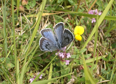 The large blue is the biggest blue butterfly. Adults fly for a very short period from the end of June to the beginning of July. It has always been rare in the UK, but declined dramatically during the 20th century and became extinct in 1979. Reintroduced in the early 1980s, small populations are now surviving in the south of England. It breeds in warm, dry, unimproved grasslands, such as coastal or limestone grasslands.How to identify