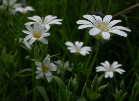 Greater stitchwort grows in woodland and along roadside verges, hedgerows and grassy banks. It has many other common names, including 'wedding cakes', 'Star-of-Bethlehem', 'daddy's-shirt-buttons' and 'snapdragon' - the latter because its stems are brittle and easily break. Its pretty, star-shaped, white flowers bloom from April to June; as the seed capsules ripen, they can be heard 'popping' in late spring.