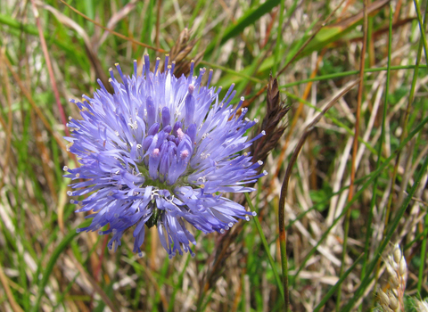 With its fluffy-looking, light blue flower heads, sheep's-bit is a pretty plant of dry grassland, heaths and clifftops. Sometimes carpeting an area, it is popular with nectar-loving insects.